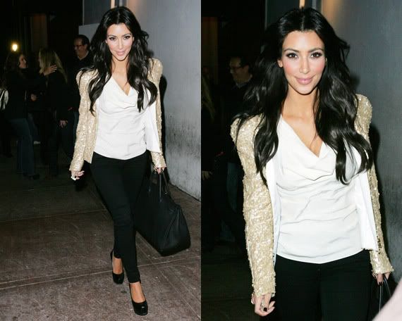 Need a quick Holiday get up? Check out Kim Kardashian in this Bebe sequin strong shoulder jacket. It's a super simple outfit, but it's totally classic. The jacket jazzes it up a bit but not where it's too crazy ya dig?